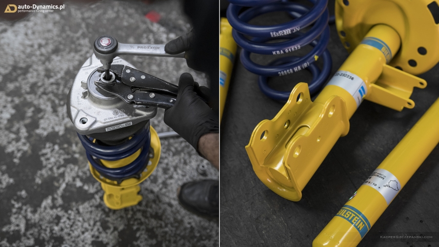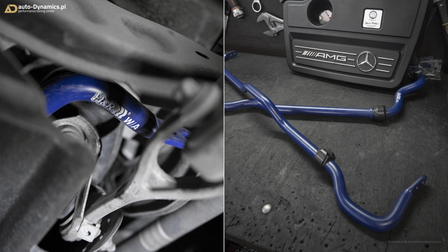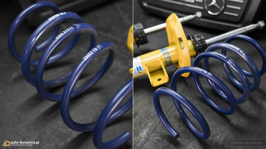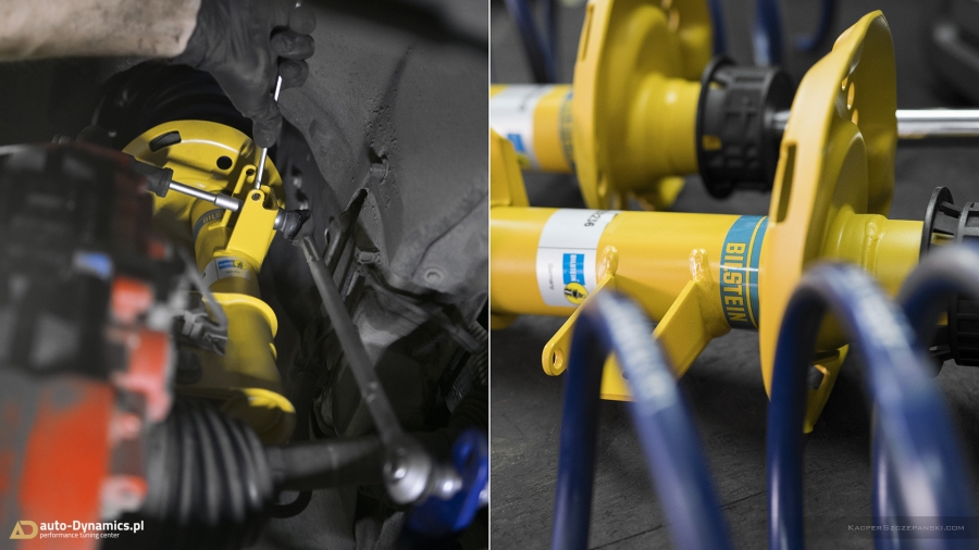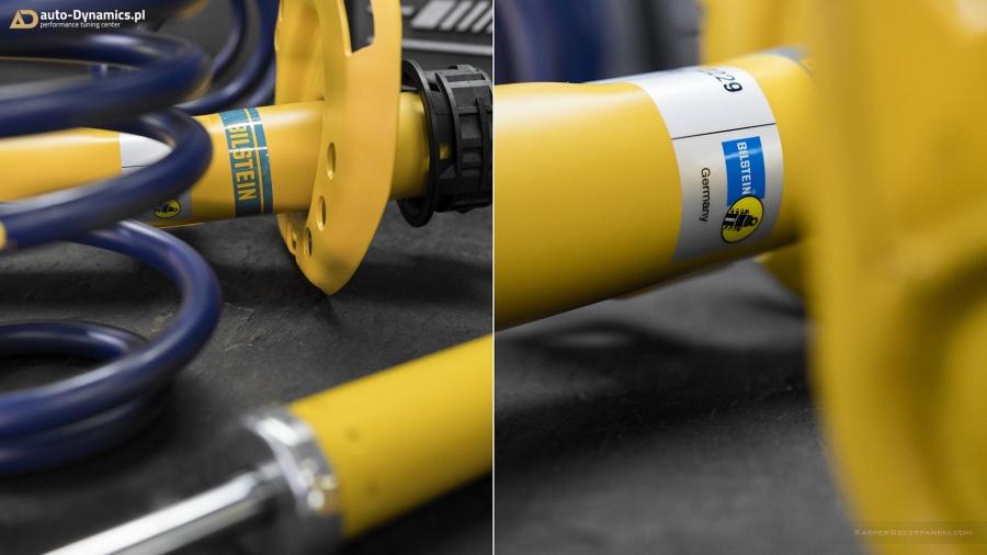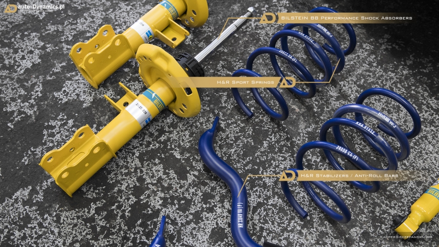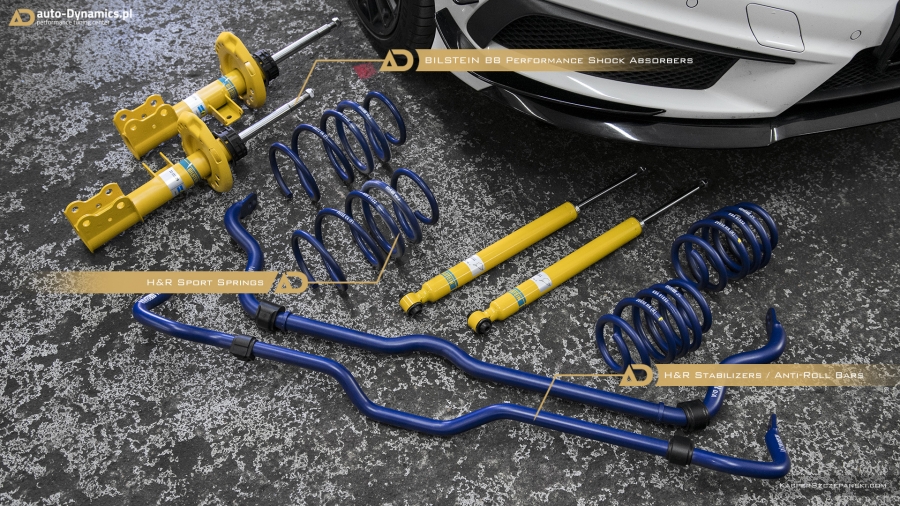 Krystalizując precyzyjne założenia koncepcyjne całego projektu dotykające w całości szerokiego spektrum związanego z zawieszeniem AMG, inicjalizację transformacji rozpoczęliśmy od wymiany fabrycznych amortyzatorów na ich sportową odmianę. W nadkolach zagościł zestaw od renomowanego, niemieckiego producenta – firmy Bilstein, a precyzyjniej – model B8 Performance charakteryzujący się przede wszystkim skróconym skokiem pracy, sportowymi właściwościami z wysokim potencjałem komfortu i fenomenalnym tłumieniem. Krótszy skok amortyzatora umożliwił bezproblemowy montaż zestawu progresywnych sprężyn usztywniająco-obniżających od niemieckiego producenta specjalizującego się w produkcji najwyższej jakości elementów dedykowanych do zawieszeń samochodowych – firmy H&R. Perfekcyjnym i wręcz obligatoryjnym uzupełnieniem zainstalowanego kompletu stanowią zamontowane grubsze, w pełni regulowane, sportowe stabilizatory skrętu – również firmy H&R. W procesie modyfikacji, czyniąc go zgodnym ze sztuką, wykorzystaliśmy ponadto szereg oryginalnych podzespołów OEM Mercedes AMG takich jak górne mocowania i łożyska amortyzatorów, zestaw nowych łączników stabilizatorów etc. Finalnie w 45’tce wykonaliśmy profesjonalną geometrię przy zastosowaniu urządzeń marki Hunter. Kompleksowość przeprowadzonej metamorfozy skutkuje diametralną wręcz poprawą prowadzenia pojazdu w każdym możliwym aspekcie. Niwelacja przechyłów bocznych, minimalizacja płużenia, obniżony środek ciężkości – to jedynie wstęp do zbioru cech którymi obecnie legitymuje się „Edition 1” a które to umożliwiają jeszcze bardziej dynamiczną a jednocześnie bezpieczniejszą jazdę dzięki spektakularnemu „czuciu pojazdu”. Aparycja pojazdu również „in plus”. #ApprovedByAD