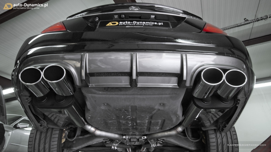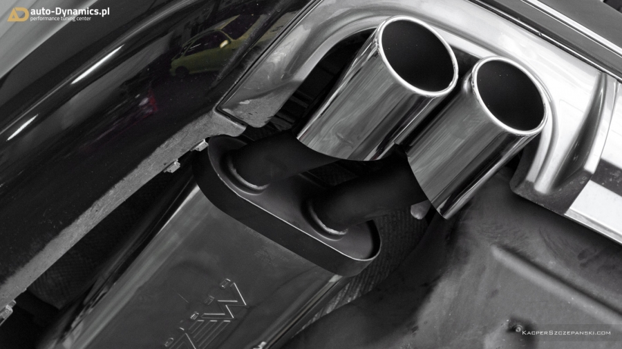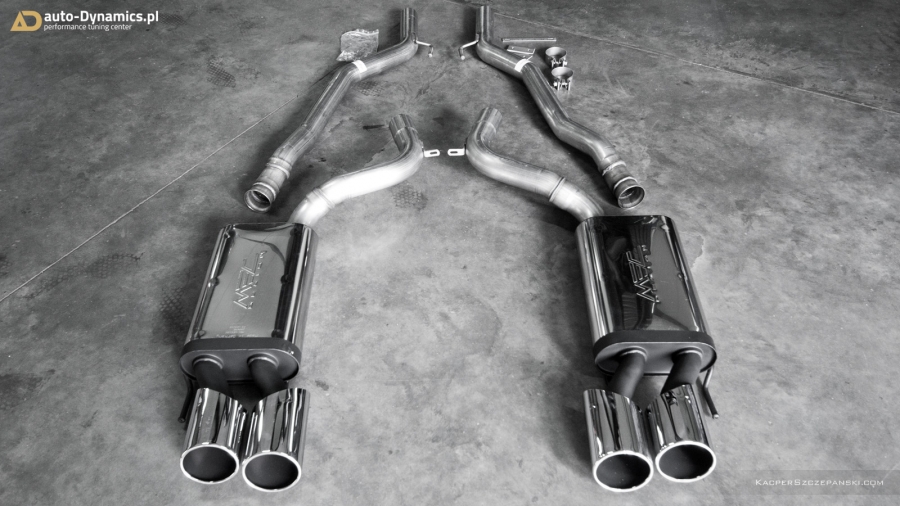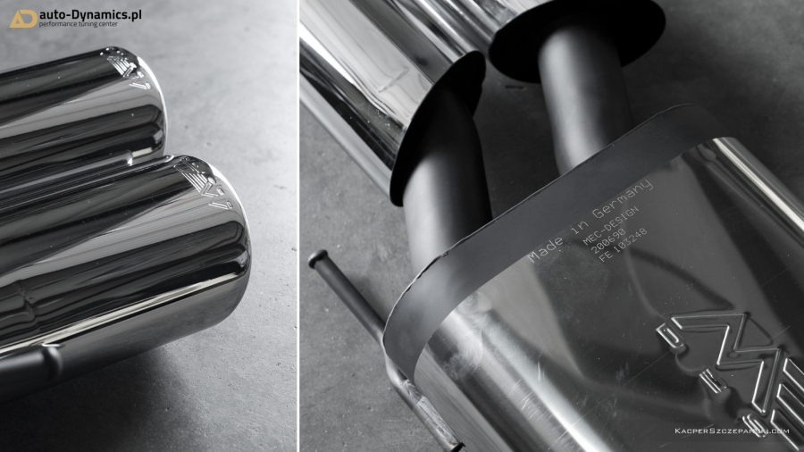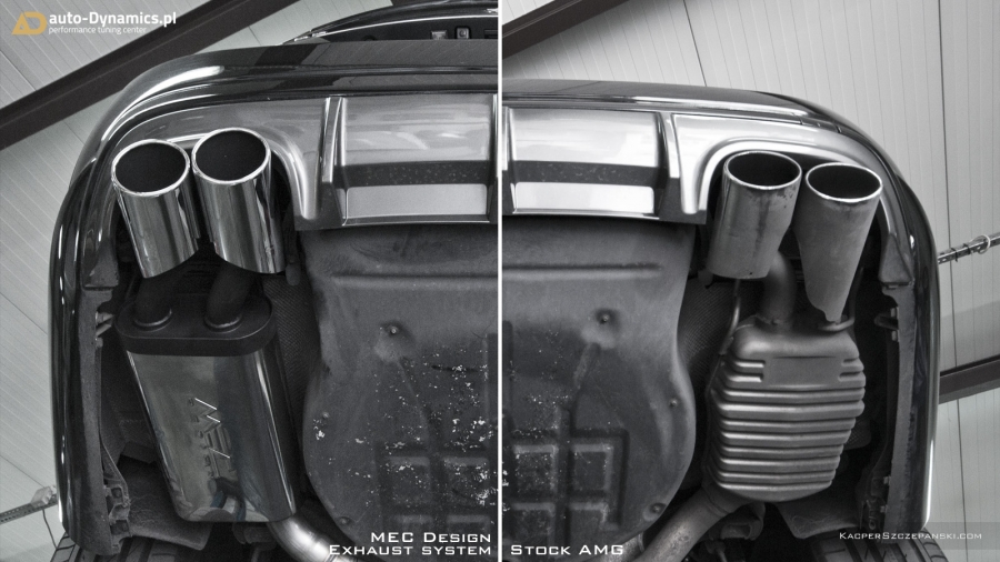 Realizując założenia koncepcyjne projektu wybór padł na bezkompromisową, najgłośniejszą konfigurację systemu wydechowego w wersji „Apocalypse” od renomowanego, niemieckiego producenta specjalizującego się wyłącznie w modyfikacjach pojazdów marki Mercedes Benz – berlińskiej firmy MEC Design. Zamontowany w AMG układ wydechowy składa się z wysoko przepustowej, w pełni przelotowej sekcji centralnej która wyeliminowała fabryczny tłumik środkowy oraz z pary sportowych tłumików końcowych zakończonych czterema owalnymi końcówkami o zwiększonej w stosunku do serii średnicy [4 x 115 mm x 85 mm], które to idealnie wypełniają otwory w tylnym dyfuzorze. Cały komplet wykonany został z nierdzewnej stali kwasoodpornej, dokładnie policzony w aplikacjach komputerowych zatem zapewnia właściwy balans pomiędzy doprężeniem a odprężeniem wolnossącej jednostki napędowej.