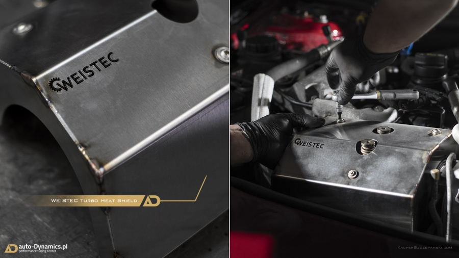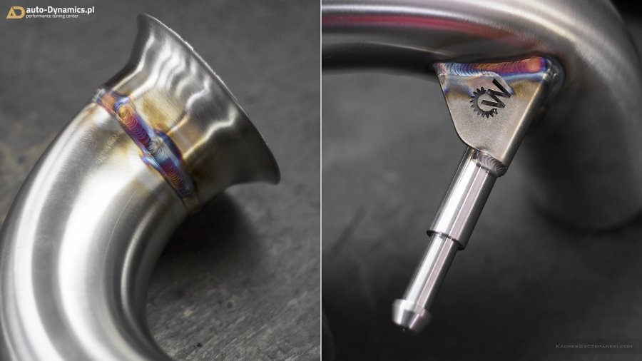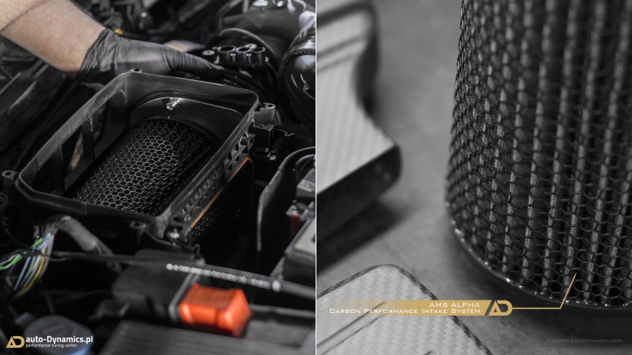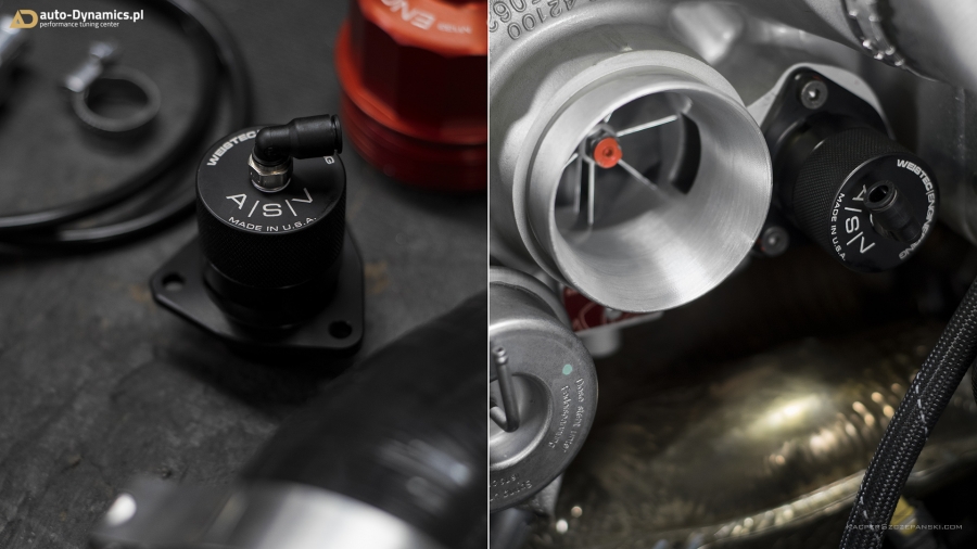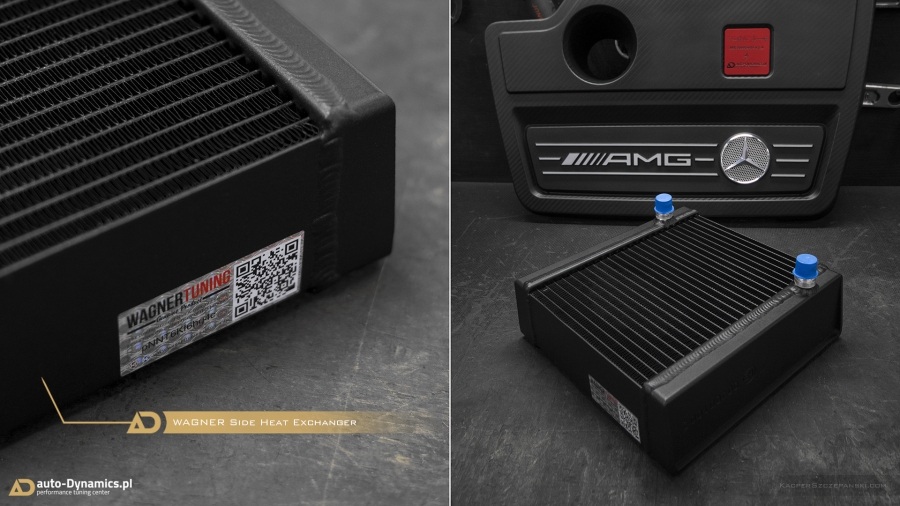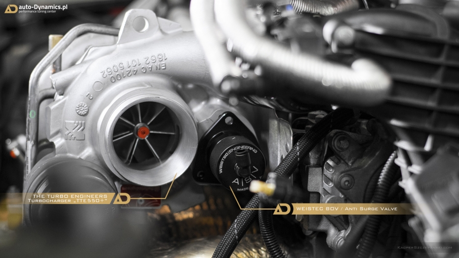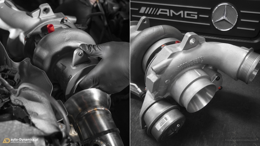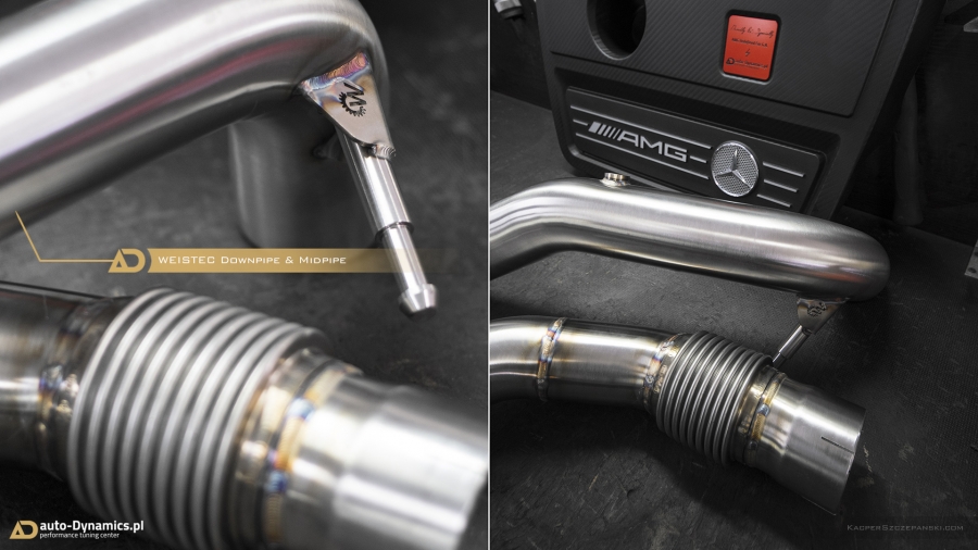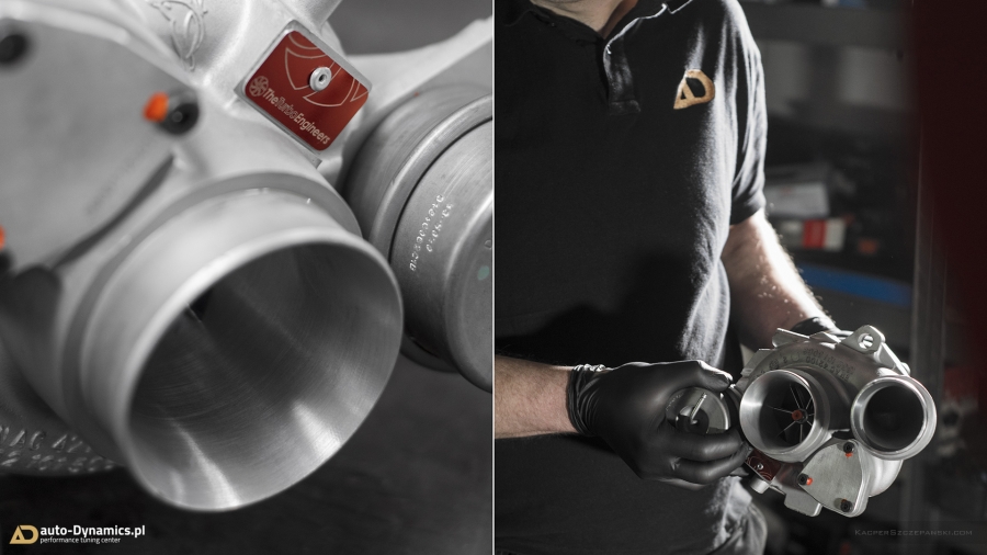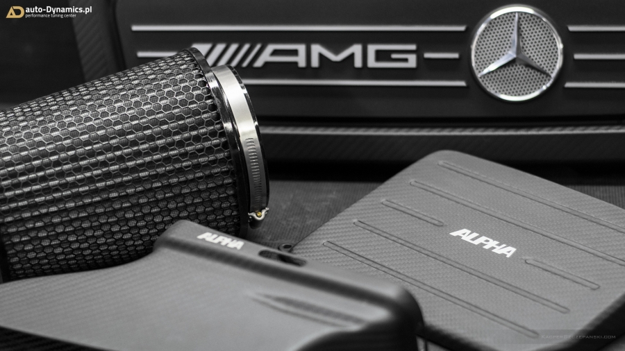 Realizując sprecyzowane założenia koncepcyjne projektu "Styks" w pierwszym etapie prac skoncentrowaliśmy się nad aspektami związanymi z maksymalną eskalacją mocy i momentu obrotowego - mającymi w konsekwencji skutkować radykalnym spotęgowaniem tabelarycznych danych technicznych pojazdu. Metamorfozę rozpoczęliśmy od wymiany fabrycznej, mało wydajnej turbosprężarki na wariant zmodyfikowany [zarówno ciepła jak i zimna strona] z serii "TTE550+". Tradycyjnie już, sięgnęliśmy po produkt od niekwestionowanego, niemieckiego lidera w dziedzinie upgrade’ów turbosprężarek – renomowanej firmy The Turbo Engineers. Kolejno celem maksymalizacji przepustowości gazów spalinowych, w AMG zamontowana została sportowa, eliminująca restrykcyjny katalizator, w pełni przelotowa rura „Downpipe” wraz z „Midpipe” firmy Weistec Engineering. Zwyczajowo rurę DP doposażyliśmy własnym sumptem w termoizolacyjną osłonę. Całość sportowego układu wydechowego dopełnia system typu cat-back austriackiego producenta – firmy Remus Innovation, naturalnie z zaimplementowanymi zaworami / przepustnicami, które to pozwalają na wybór trybu głośności pracy systemu wydechowego, co w konsekwencji pozwala w dalszym ciągu podróżować AMG w warunkach bardzo komfortowych. Seryjny, skrajnie niewydolny, papierowy filtr powietrza ustąpił miejsca profesjonalnemu, wykonanemu z włókna węglowego [carbon fiber] systemowi dolotowemu zapewniającemu radykalną poprawę dawki zimnego powietrza doprowadzanego do nowej turbosprężarki. Układ dolotowy amerykańskiej firmy AMS Alpha. Kolejna faza prac to intensyfikacja działań związanych z diametralną poprawą wydajności systemu chłodzenia. Zawodne, seryjne wymienniki ciepła tj. centralny oraz pomocniczy – boczny, zastąpiliśmy ich ultra efektywnymi zamiennikami o zwiększonych rdzeniach. Oba coolery / chłodnice pochodzą od bezkonkurencyjnego, czołowego, niemieckiego producenta – firmy Wagner Tuning. W całym systemie chłodzenia wymieniliśmy dodatkowo płyn na produkt firmy Motul. Dalszy epizod dotyczył wymiany seryjnego zaworu DV na wariant upustowy - atmosferyczny ASV / BOV firmy Weistec - znacznie poprawiający reakcję turbosprężarki, której osłonę termiczną zastąpiliśmy wariantem cechującym się lepszą rozpraszalnością ciepła [osłona firmy Weistec]. Fabryczne, puchnące łączniki pomiędzy przepustnicą a coolerem oraz między coolerem a sprężarką ustąpiły miejsca wydajniejszym, termoodpornym oraz zbrojonych oplotem stalowym silikonowym zamiennikom [pakiet firmy Weistec]. Efekty naszego zabiegu zmierzone na hamowni, wykorzystując potencjał wszystkich przeprowadzonych modyfikacji mechanicznych, po dokonaniu profesjonalnego, indywidualnego strojenia [chiptuning] jednostki ECU [jak i TCU] to 535KM i 640Nm. Właściwości fabryczne podane przez MB to: 381KM i 475Nm [Wyniki pomiaru rzeczywistych wartości to 371KM i 454Nm]. Bilans przyrostu: +164KM i +186Nm. Ponadto V-MAX ca. 320km/h i 100-200km/h równe 7.0s [fabrycznie / seryjnie 12,5s].