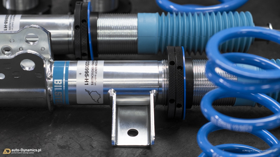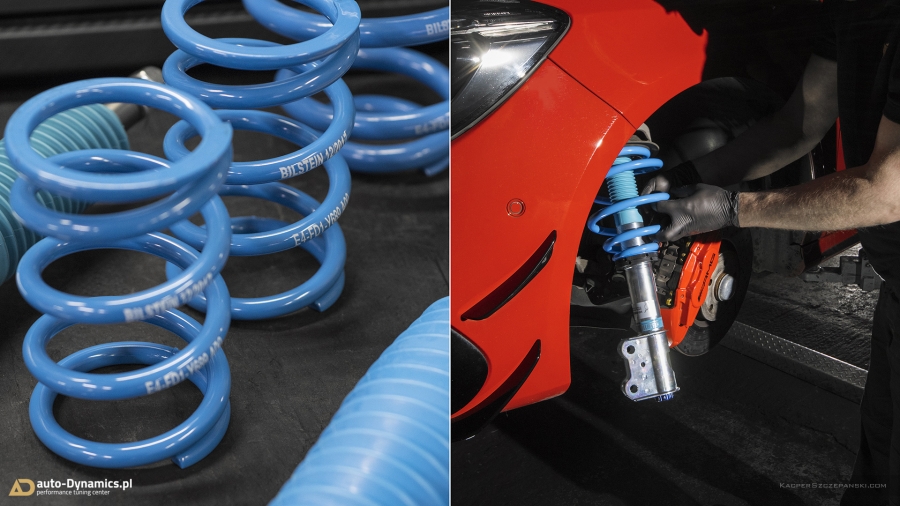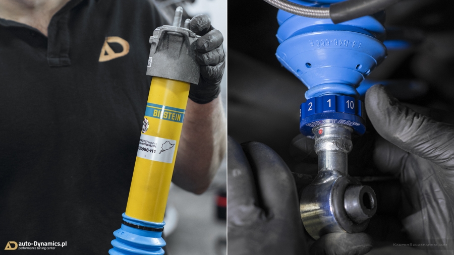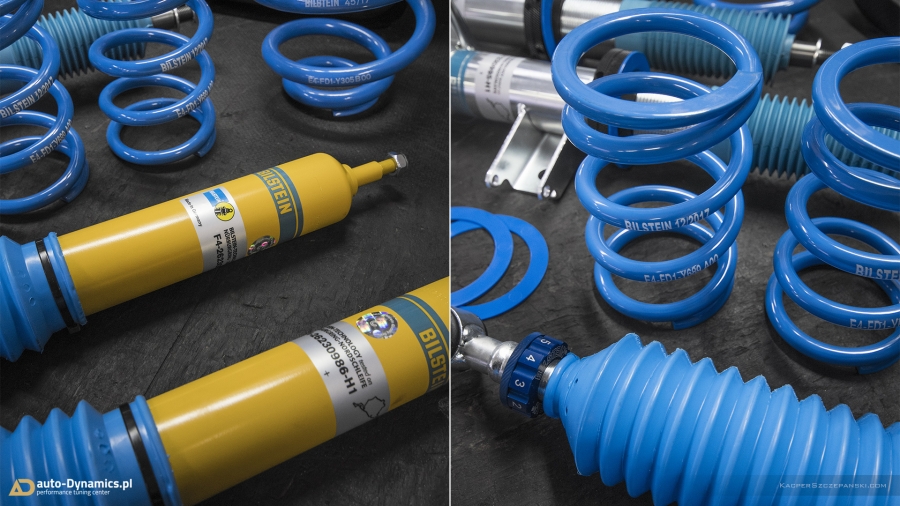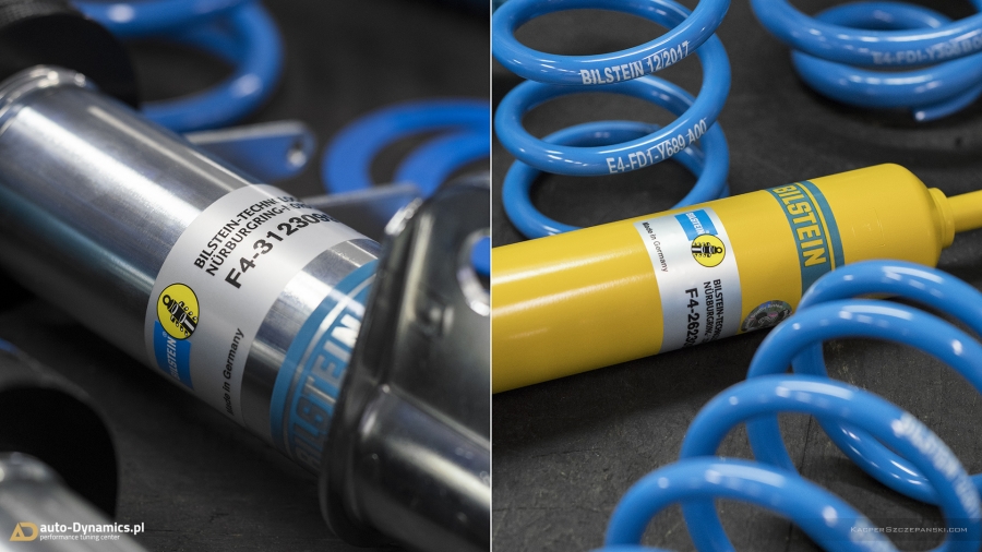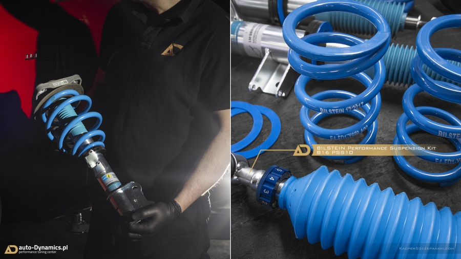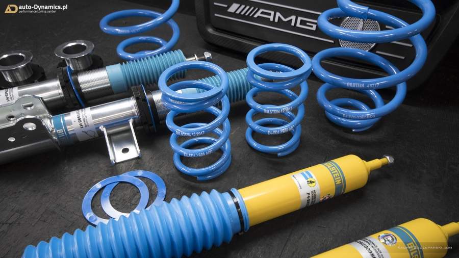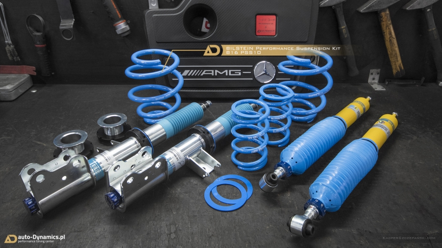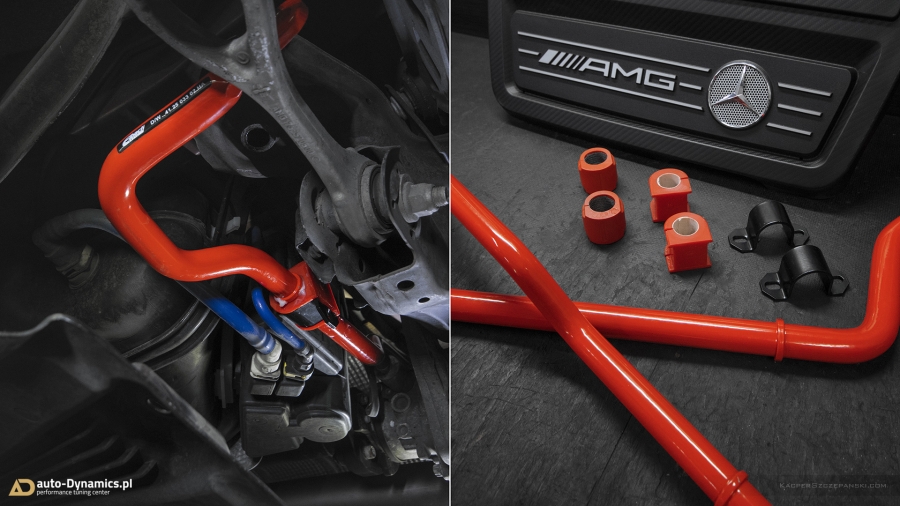 Drugi etap modyfikacyjnej metamorfozy to koncentracja prac zespołu auto-Dynamics.pl nad szeroko pojętymi aspektami poprawy trakcji, prowadzenia oraz intensyfikacji doznań z kierowania pojazdem. Sięgając po sprawdzone, kompetentne rozwiązania i solucje, Styks wyposażony został w komplet profesjonalnego, sportowego zawieszenia gwintowanego od jednego z liderów w swojej klasie, niemieckiej firmy Bilstein. Zaopatrzony w możliwość szerokiej regulacji, model PSS10 B16 prócz znacznego obniżenia środka ciężkości, zapewnił fantastyczny wręcz „feeling” prowadzenia przy jednoczesnym zachowaniu pozytywnego komfortu podczas codziennej eksploatacji. Zawieszenie Bilstein otrzymało ponadto support pod postacią kompletu grubszych, również w pełni regulowanych, sportowych stabilizatorów skrętu [niemieckiej firmy Eibach] które w całości odpowiadają za niwelację przechyłów bocznych pojazdu. W procesie modyfikacji, czyniąc go zgodnym ze sztuką, wykorzystaliśmy ponadto szereg oryginalnych, nowych podzespołów OEM Mercedes AMG takich jak górne mocowania i łożyska amortyzatorów, zestaw łączników stabilizatorów etc. Finalnie w 45’tce wykonaliśmy profesjonalną geometrię przy zastosowaniu urządzeń marki Hunter. Nie bez znaczenia pozostaje również fakt nowej, agresywnej aparycji pojazdu dzięki minimalizacji prześwitu, co w konsekwencji czyni odbiór bryły pojazdu „expressis verbis” eksplicytnym.