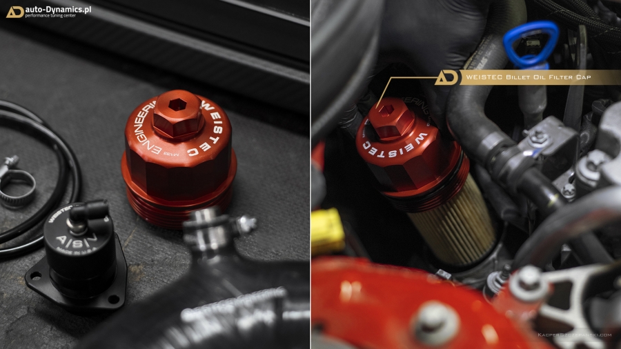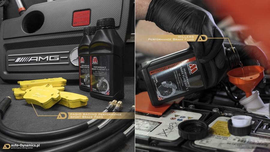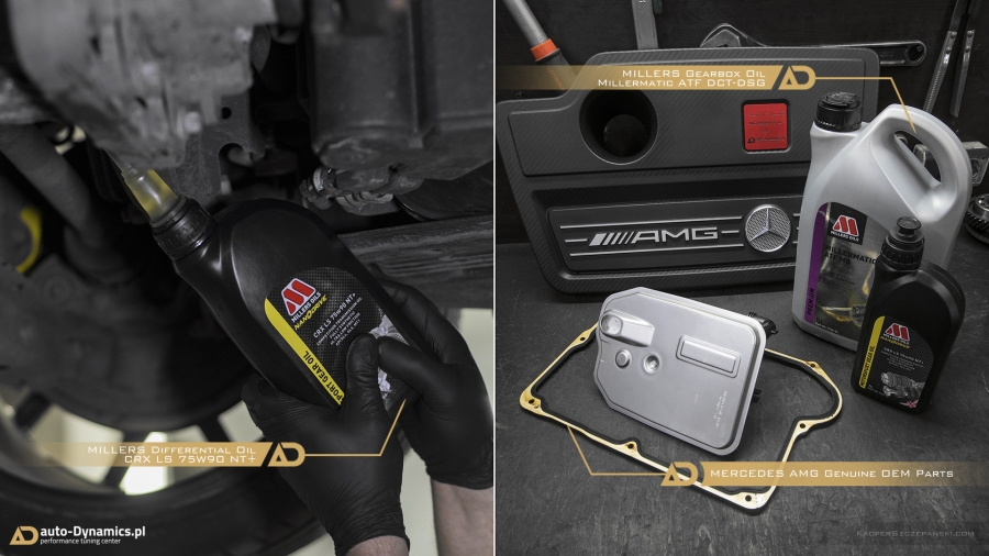 Celem maksymalnego wykorzystania właściwości i parametrów nowego zespołu najwyższej klasy podzespołów oraz poprawy charakterystyki pracy i skuteczniejszej ochrony przekładni AMG SPEEDSHIFT DCT 7-Gang-Sportgetriebe, w całym układzie wymieniony został olej na wyczynową, wydajniejszą odmianę pochodzącą z palety produktów brytyjskiej firmy Millers - Millermatic ATF DCT-DSG, naturalnie w połączeniu z kompletem nowych [OEM MB] części i filtrów przewidzianych przez producenta do przeprowadzenia takowej procedury w automatycznej skrzyni AMG. Pozostając w tematyce czynników smarujących i lubrykantów - „Styks'owi” zaaplikowaliśmy pełen profesjonalny serwis olejowy z wykorzystaniem zaufanych i niezawodnych olei Millers, które znacznie przewyższają zadane przez stuttgarcką fabrykę normy. Dwu-litrowa jednostka napędowa kodyfikowana przez producenta jako M133DE20AL zapełniona została wyczynowym olejem z serii Motorsport, o specyfikacji 10W60 – CFS z NT+. Naturalnie po wcześniejszym zastosowaniu płukanki silnikowej Millers [Engine Flush] odpowiednio przygotowującej M133 do współpracy z najwyższej próby olejem. Dyferencjały tj. mechanizmy różnicowe o ograniczonym poślizgu wypełnione zostały olejem CRX LS NT+ o charakterystyce 75W90 – pochodzącym również z ultra wydajnej serii Motorsport. Ponadto, kierując się czystą estetyką, filtr oleju zamknęliśmy aluminiowym odpowiednikiem plastikowej OEM pokrywy. Element wykonany w technologii CNC, wykończony w barwie czerwonej - anodowany [część firmy Weistec] który idealnie współgra z czerwono – czarną stylistyką komory silnika którą własnym sumptem i kreatywnością – zaaranżowaliśmy w indywidualnym ale i koherentnym z całością stylu. Włącznie z specjalnie zaprojektowaną przez nas, personalną tabliczką identyfikującą mocno zmodyfikowane przez auto-Dynamics.pl pojazdy z stajni AMG.