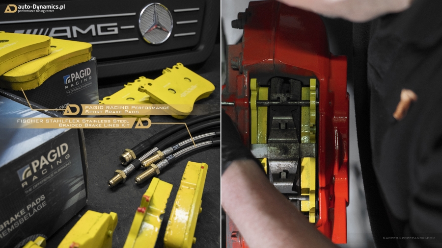 Czyniąc tuning odpowiedzialnym, uwzględniając jednocześnie radykalny przyrost mocy i momentu obrotowego, nieracjonalnym, nierozważnym a przede wszystkim niebezpiecznym byłby fakt braku modyfikacji w układzie hamulcowym który swoją wątpliwą wydajność zapewniał jedynie do fabrycznych, dość niskich osiągów. W pierwszej fazie fabryczne, gumowe, puchnące a z czasem parciejące przewody hamulcowe zastąpiliśmy ich sportową odmianą – przewodami w stalowym oplocie od naszego wielokrotnie sprawdzonego partnera – niemieckiej firmy Fischer Hydraulik / Stahlflex. W zaciskach przednich i tylnych AMG zagościły wyczynowe klocki hamulcowe firmy Pagid Racing, mieszanka RS29 idealnie realizująca swoje działania podczas dynamicznej, miejskiej i autostradowej jazdy. RS29 perfekcyjnie spełni swoją funkcję również podczas okolicznościowych „Track Day’s”. W całym układzie hamulcowym wymieniony został płyn na wyczynowy wariant o ekstremalnie wysokiej temperaturze wrzenia i znakomitej odporności higroskopijnej [Płyn „Performance Brake Fluid” brytyjskiej firmy Millers]. Przy zwiększonej mocy - modyfikacja ta w znaczny sposób przekłada się na poprawę bezpieczeństwa zarówno kierowcy i pasażerów.