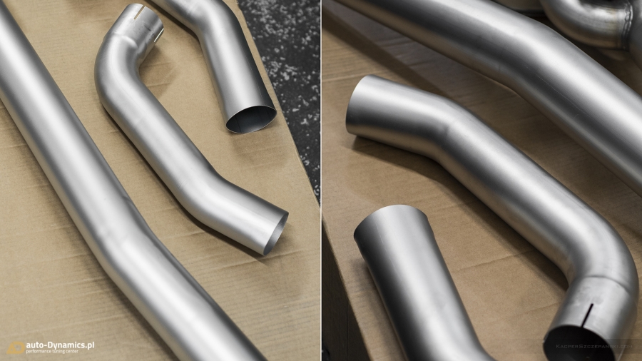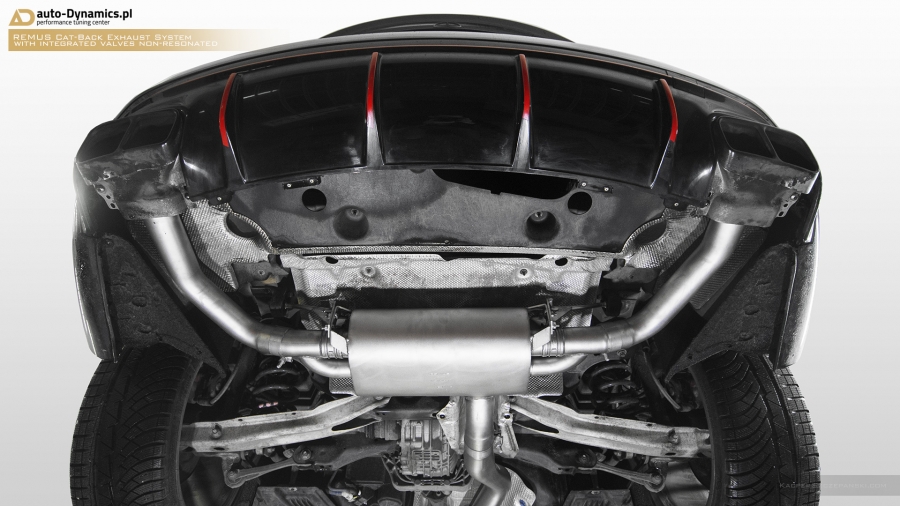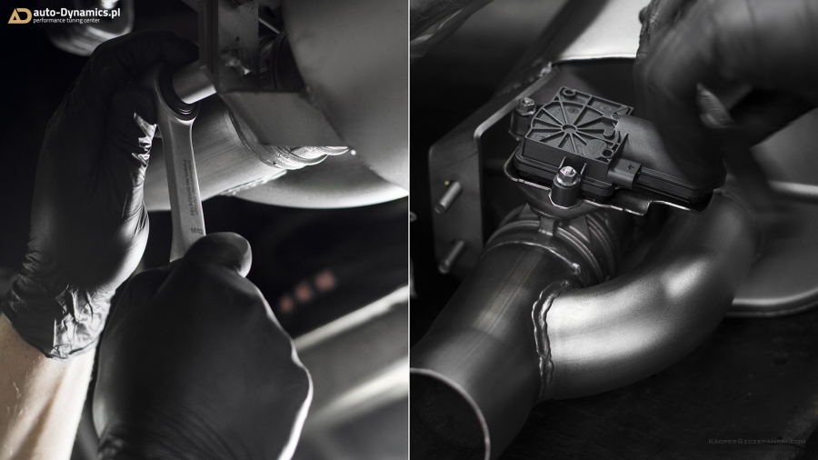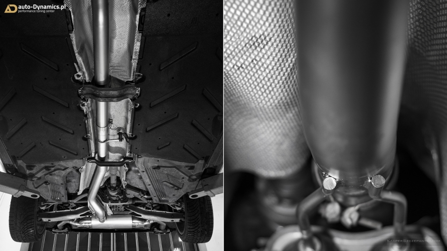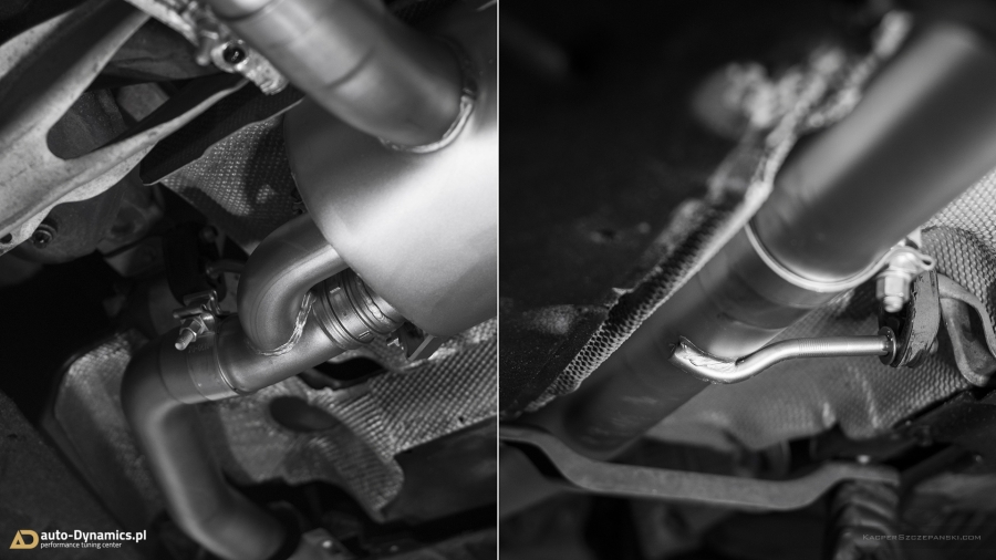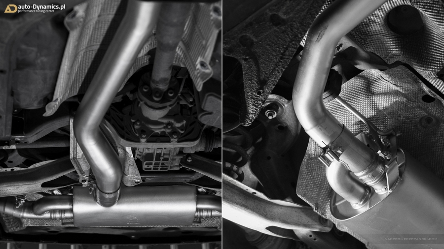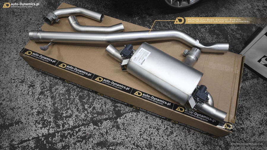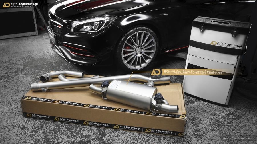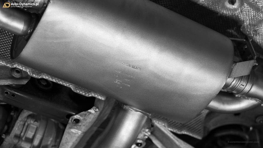 Poliftowy egzemplarz Mercedes-Benz CLA45 AMG [C117] wyposażyliśmy w sportowy, fenomenalnie brzmiący, układ wydechowy od renomowanego, austriackiego producenta – firmy Remus Innovation. Kompletny system składający się z nierezonowanej, maksymalizującej przepustowość spalin sekcji centralnej, ultra-lekkiego tłumika końcowego z zaimplementowanym systemem zaworów / przepustnic których pracą zawiaduje onboard’owy / fabryczny komputer AMG. Układ, dzięki przeprojektowanej drodze spalin, maksymalizuje przepustowość gazów spalinowych co w konsekwencji skutkuje wzrostem mocy i momentu obrotowego. Nie bez znaczenia pozostaje również kwestia znacznej redukcji masy tłumika końcowego. Poziom akustyki oraz charakterystykę dźwięków generowanych przez wykonany z nierdzewnej stali kwasoodpornej układ wydechowy cechuje zdumiewająco poprawnie wyważony balans pomiędzy niskimi, średnimi jak i wysokimi tonami. Pracujące w trybie zamkniętym zawory pozwalają w arcy-komfortowych warunkach pokonywać autostradowe odległości a tryb otwartych zaworów stanowi wulkaniczną erupcję, eksplozję i salwę nasyconych agresywną barwą dźwięków. #ApprovedByAD