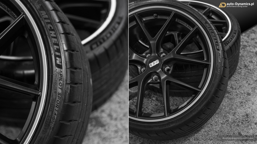 Dbając o każdy szczegół modyfikacyjnej ewolucji, celem prawidłowego przekazania mocy oraz momentu obrotowego – w fazie trzeciej, CLA 45 AMG otrzymał nowy zestaw kół. Kompletacja w postaci aluminiowych, 19 calowych felg, kultowej, legendarnej firmy BBS, model CI-R z serii „Performance” w kolorze "Satin Black". Felgi wyposażone zostały w zestaw sportowych opon klasy high-performance – francuskiej firmy Michelin. Nie mający sobie równych, topowy model - Pilot Sport 4S [4 x 245/30/19]. Agresywne ET, 9-calowa szerokość w fuzji z nieprawdopodobnie przyczepną oponą - zestaw zapewnił niebywałą wręcz trakcję i „czucie” pojazdu a dynamicznie pokonywanie ostrych łuków sprawia teraz jeszcze więcej szybkiej, drogowej przyjemności. Aparycja pojazdu dzięki idealnie wpisującym się w linię bryły pojazdu felgom BBS – również „level-up”.