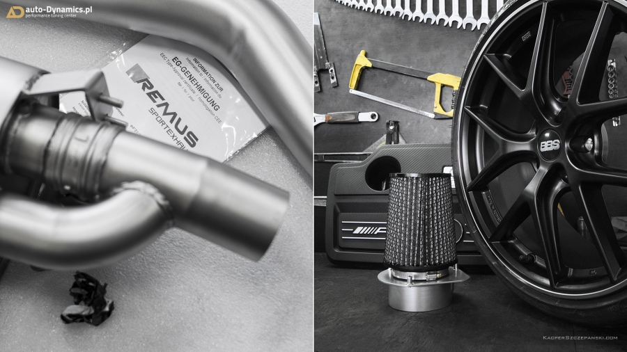 W pierwszej kolejność CLA45 AMG wyposażyliśmy w sportowy, fenomenalnie brzmiący, układ wydechowy od renomowanego, austriackiego producenta – firmy Remus Innovation. Kompletny system składający się z nierezonowanej, maksymalizującej przepustowość spalin sekcji centralnej, ultra-lekkiego tłumika końcowego z zaimplementowanym systemem zaworów / przepustnic których pracą zawiaduje onboard’owy / fabryczny komputer AMG. Poziom akustyki oraz charakterystykę dźwięków generowanych przez wykonany z nierdzewnej stali kwasoodpornej układ wydechowy cechuje zdumiewająco poprawnie wyważony balans pomiędzy niskimi, średnimi jak i wysokimi tonami. Pracujące w trybie zamkniętym zawory pozwalają w arcy-komfortowych warunkach pokonywać autostradowe odległości a tryb otwartych zaworów stanowi wulkaniczną erupcję, eksplozję i salwę nasyconych sportową orientacją dźwięków.