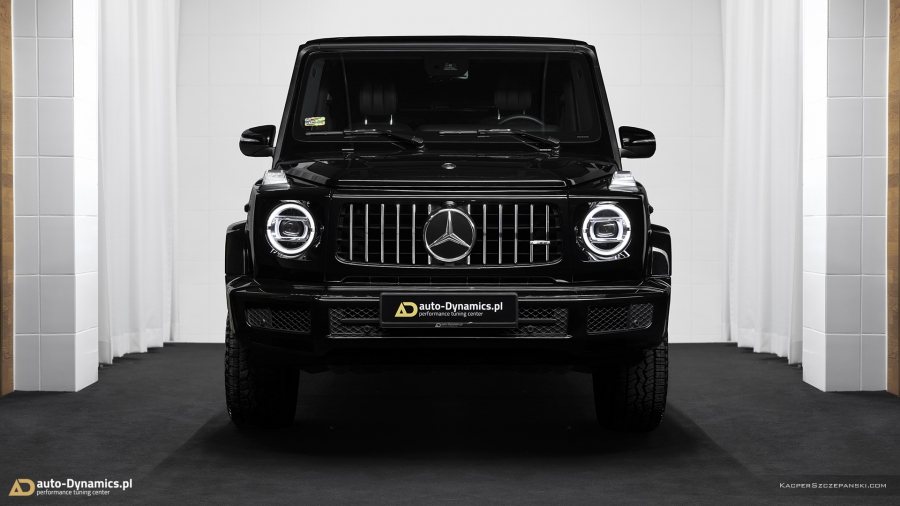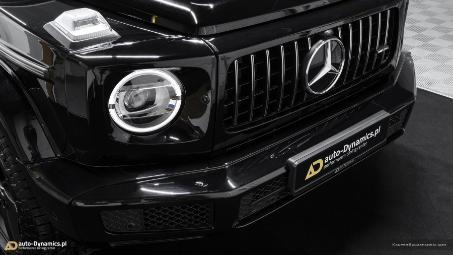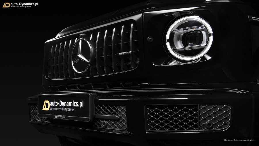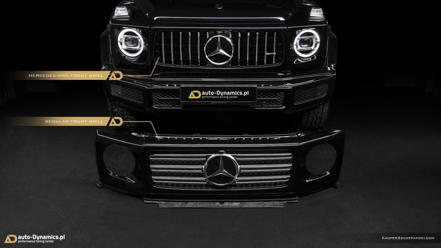 Krystalizując precyzyjne założenia koncepcyjne, w Gelendzie trzeciej generacji przeprowadziliśmy pełną, profesjonalną konwersję przedniej sekcji pojazdu z standardowego grilla z użebrowaniem horyzontalnym na grill z użebrowaniem wertykalnym. Kompleksowa modyfikacja niosła za sobą szereg towarzyszących zmian jak choćby wymianę obudów świateł przednich tudzież wymianę podstawy mocującej centralnego obramowania nowej atrapy chłodnicy zwanej "Panamericana" instalowanej w modelach G63 AMG. Istotnym do podkreślenia pozostaje fakt, iż całościową trawestację przeprowadziliśmy w #AD z wykorzystaniem wyłącznie nowych i oryginalnych [OEM] części Mercedes-AMG. Wszystkie, użyte do modernizacji podzespoły, zostały wylakierowane przez nas w kolorze bazowym pojazdu tj. „Deep Black 040” celem pełnej integracji z lakierem karoserii. #GbyAD