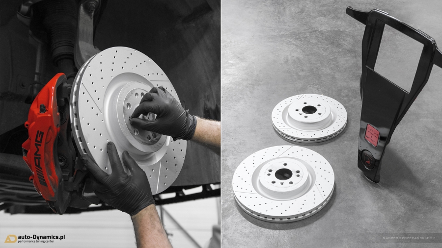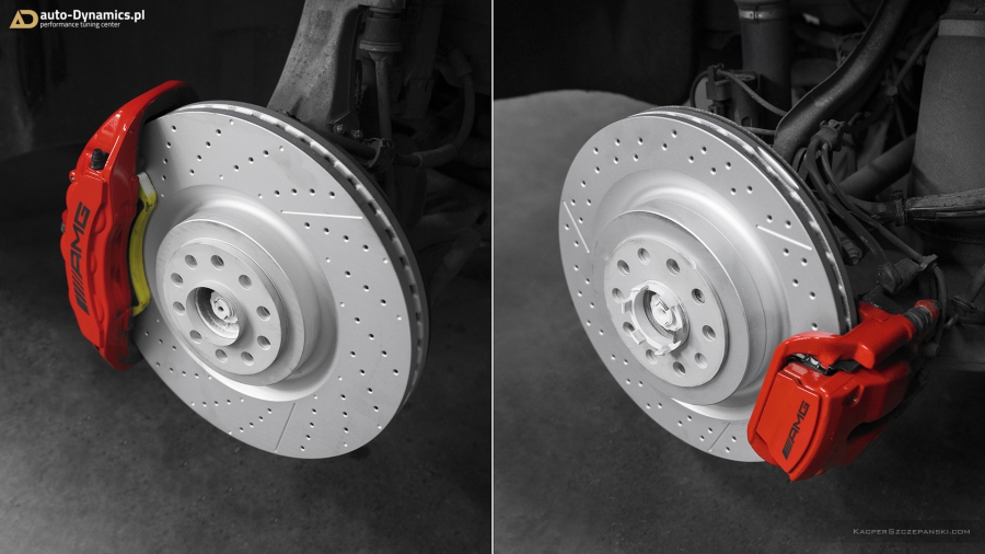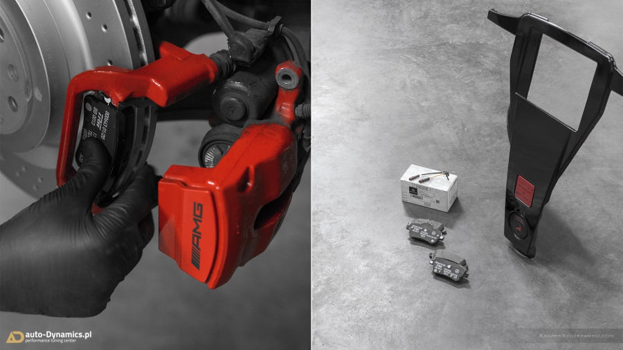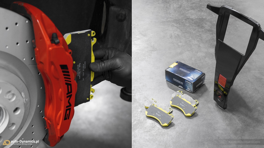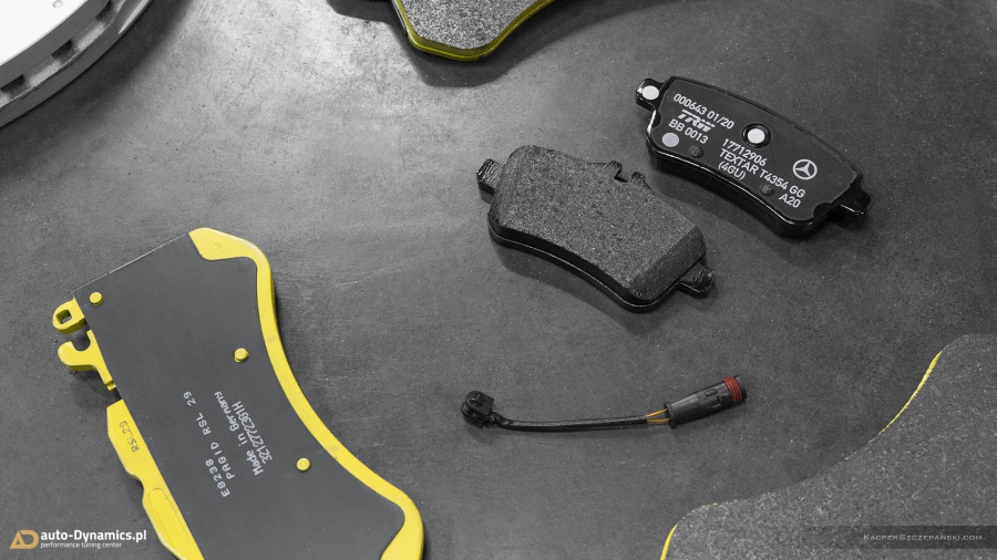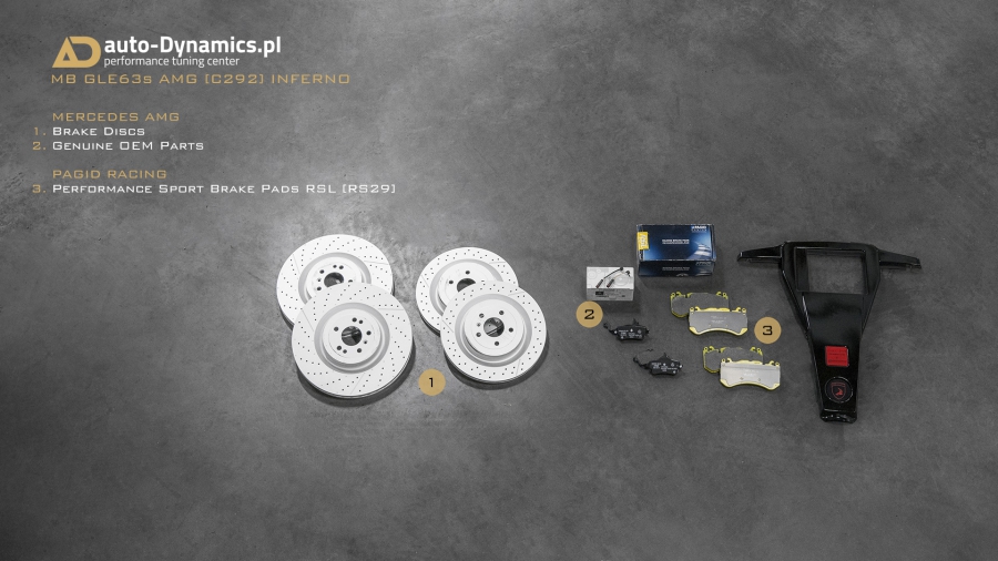 Na system hamulcowy ważącego ponad dwie tony pojazdu oddziaływają potężne siły. W szczególności gdy pojazd legitymuje się mocą przekraczającą 800KM i 1200Nm. Wyhamowywanie tytanicznego INFERNO nie jest zadaniem trywialnym dlatego już w pierwotnej fazie projektu układ hamulcowy doposażyliśmy w zestaw przewodów hamulcowych w stalowym oplocie od naszego wielokrotnie sprawdzonego partnera – niemieckiej firmy Fischer Hydraulik / Stahlflex a w całym układzie hamulcowym wymieniony został płyn na wyczynowy wariant o ekstremalnie wysokiej temperaturze wrzenia i znakomitej odporności higroskopijnej [Płyn „Performance Brake Fluid” brytyjskiej firmy Millers]. Po przebytych, absolutnie bezproblemowych i bezawaryjnych od procesu modyfikacji 25 000 kilometrów, podczas audiencji w naszym serwisie, w GLE63 S AMG ponownie zainstalowaliśmy zestaw ultra wydajnych, bezkonkurencyjnych, sportowych klocków hamulcowych z serii RSL [mieszanka RS29] niemieckiej firmy Pagid Racing. Zestaw elitarnych klocków Pagid Racing kooperować będzie z nowymi, wentylowanymi, nacinano-nawiercanymi tarczami Mercedes-AMG. Naturalnie za status zużycia nowych klocków odpowiadać będą OEM czujniki MB-AMG. Konglomerat wszystkich zainstalowanych podzespołów przeistacza fabryczny system hamulcowy w niezawodne, maksymalizujące poziom bezpieczeństwa narzędzie którego praca przekłada się bezpośrednio na gwarancję spokoju, zarówno kierowcy jak i pasażerów. Korzystając z obecności INFERNO w auto-Dynamics.pl, współbieżnie z pracami serwisowymi a uwzględniając interwały konserwacyjne, w AMG przeprowadziliśmy dodatkowo pełną, profesjonalną rewizję całego układu hamulcowego. Wszystkie wykonane czynności przeglądowo-serwisowe systemu hamulcowego, przy zachowaniu szczegółowych procedur i wytycznych Daimler AG oraz naszych wewnętrznych, wyśrubowanych standardów dla pojazdów przez nas zmodyfikowanych – gwarantują bezawaryjną i bezproblemową eksploatację pojazdu o zwiększonej mocy przez kolejne dziesiątki-tysięcy kilometrów.