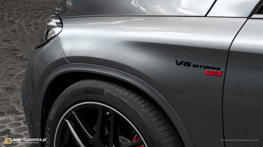 Celem zapewnienia ostatecznego szlifu i nadania jeszcze wyższej stabilności – w GLE63 S zainstalowany został zestaw aluminiowych dystansów poszerzających niemieckiej firmy Eibach w kolorze czarnym. Montaż pierścieni dystansujących [przód: 2 x 20 mm strona / 40 mm oś, tył: 2 x 20 mm strona / 40 mm oś] pozwolił zrównać 22" felgi AMG z linią błotnika i idealnie wypełnić nadkola - stawiając tym samym przysłowiową „kropkę nad i”. Ponadto przednie błotniki otrzymały nieprzypadkowe, bowiem nawiązujące do koloru zacisków hamulcowych - czerwone insygnia „700” odnoszące się do aktualnej mocy, którą obecnie po naszych modyfikacjach legitymuje się Mercedes-Benz GLE63 S AMG [C292]. Dodatkowo w pojeździe zainstalowany został, w pełni programowalny akcelerator przyspieszenia zmieniający charakterystykę pracy pedału na bardziej agresywną [produkt niemieckiej firmy – Novatune].