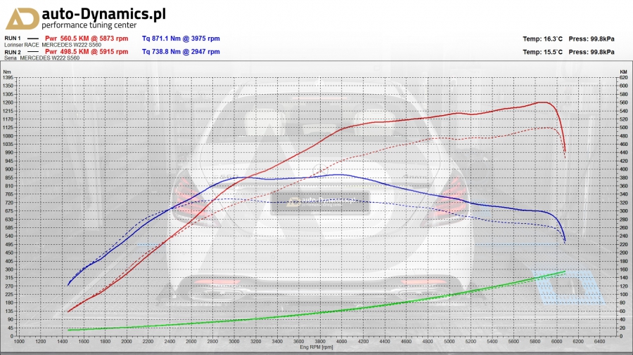 Nad ów wyjątkowym egzemplarzem eS-klasy mieliśmy w #AD sposobność pracować onegdaj, koncentrując się wówczas nad eskalacją akustyki, szczególnie uwielbianej przez pasjonatów motoryzacji V-Ósemki [mods-#1]. Wykorzystując mechaniczny potencjał przeprowadzonych w pierwszym etapie zmian, tj. maksymalizacji przepustowości gazów spalinowych wnoszonych przez wysoce-wydajny, kompletny, sportowy układ wydechowy renomowanej niemieckiej manufaktury – atelier Capristo przystąpiliśmy ochoczo do dalszych modyfikacji. W S560 zamontowaliśmy sportowe, wysokoprzepustowe, wieczyste filtry powietrza od renomowanego, włoskiego producenta - firmy BMC które to wyeliminowały skrajnie niewydolne, papierowe filtry, dostarczające po wymianie większą dawkę chłodnego powietrza to komory spalania przy jednoczesnej, efektywniejszej filtracji zanieczyszczeń. Filtry BMC w fuzji z układem wydechowym Capristo tworzą kompletną modyfikację typu „wdech + wydech” która to w finalnym rezultacie, przekuwa się w znaczny przyrost mocy i momentu obrotowego. Spinając klamrą wszystkie powyższe zmiany, przystąpiliśmy do transformacji kolejnych kryteriów. Zakładając poprawę elastyki i eskalację osiągów 4-litrowej, dualistycznie-turbodoładowanej, widlastej jednostki napędowej sygnowanej przez MB jako M176DE40AL, celem dynamicznej intensyfikacji właściwości tabelarycznych generowanych przez ośmio-cylindrowy silnik, w S560 [generacji W222] zainstalowany został profesjonalny, w pełni cyfrowy, dedykowany, zewnętrzny komputer ECU [Engine Control Unit] wraz z specjalną, rozbudowaną wiązką elektroniczną komunikującą się z sensorami magistrali CAN. Modyfikacja ta jest nieinwazyjna, nie wymaga zmian w fabrycznym oprogramowaniu i jest w pełni odwracalna gdy sytuacja tego wymaga [moduł wraz z wiązką można zdemontować bez pozostawienia żadnych śladów (mechanicznych i elektronicznych)]. Zainstalowany przez #teamAD kontroler wywodzi się z serii PowerModul od renomowanego, niemieckiego producenta i tunera pojazdów marki Mercedes-Benz – firmy Lorinser. Zaawansowany, zewnętrzny sterownik ECU zapewnia osiągi i bezpieczeństwo silnika identyczne do klasycznego chiptuningu. Moduł korzysta z map z dynamiczną adaptacją - monitoruje wiele wartości w czasie rzeczywistym i elastycznie dobiera wskazania, sięgają po drzemiący w cztero-litrowej jednostce potencjał i przekuwa go w potężny przyrost mocy i momentu obrotowego jak również znacznie zwiększa elastyczność dostępną w pełnym zakresie obrotów. Właściwości nominalne / katalogowe przedstawione przez MB to: 469KM (345kW) i 700Nm [Wyniki pomiaru wartości rzeczywistych po zainstalowaniu układu wydechowego i filtrów powietrza to 498KM (366kW) i 738Nm]. Efekty naszego zabiegu zmierzone na hamowni [na paliwie RON98] to 560KM (411kW) i 871Nm [Przyrost: +91KM (+66kW) i +171Nm w stosunku do wartości katalogowych a +62KM (+45kW) i +133Nm w stosunku do wartości rzeczywistych po wniosionych modyfikacjach mechanicznych (Capristo + BMC)]. Wzrost parametrów na tym poziomie zapewnia absolutną bezawaryjność jednostki napędowej w połączeniu z rewelacyjnymi osiągami pozwalającymi na bezpieczne oraz dynamiczne wyprzedzanie w każdych okolicznościach i warunkach drogowych. Różnica przyspieszenia zarówno w przedziale 0-100km/h jak i 100-200km/h oraz 200km/h-UP jest absolutnie kolosalna. Odczucia z jazdy, szczególnie w połączeniu z napędem 4Matic, są teraz naprawdę niesamowite, a elastyczność dzięki momentowi obrotowemu dostępnemu w szeroki i pełnym zakresie obrotów zdumiewa na każdym biegu! #eSKlasseByAD