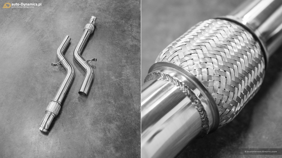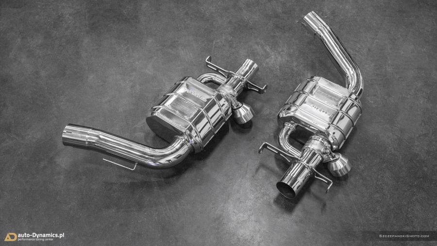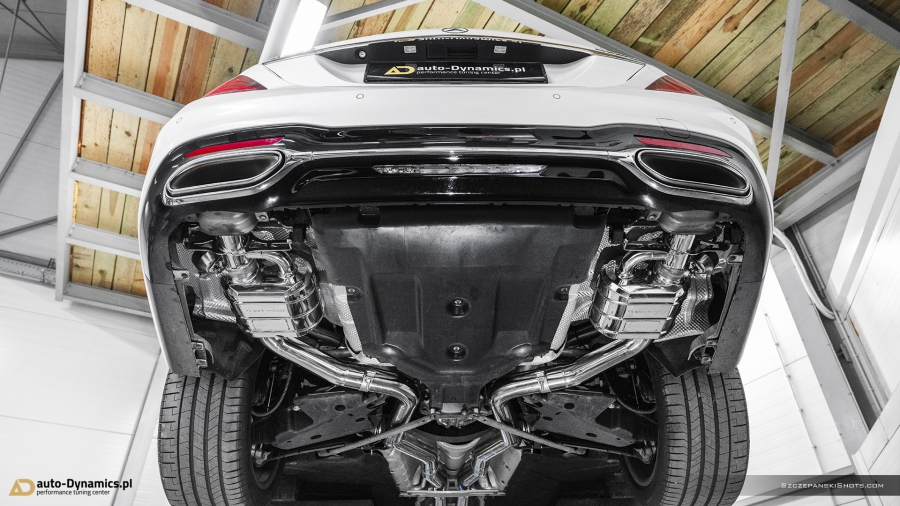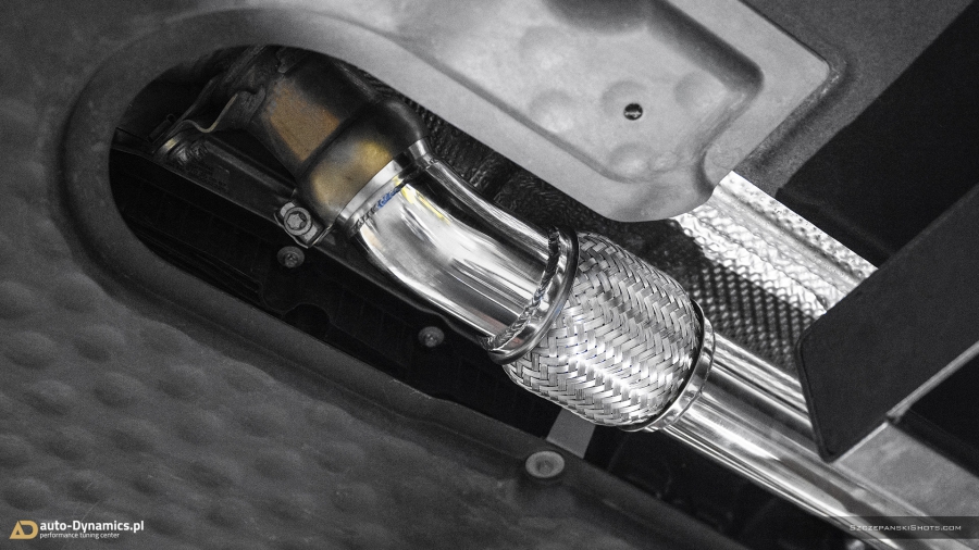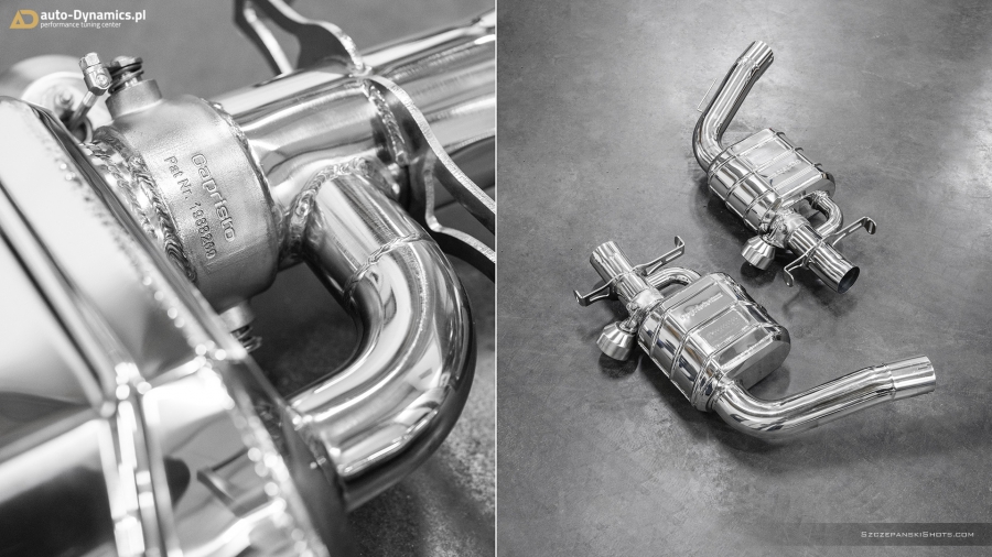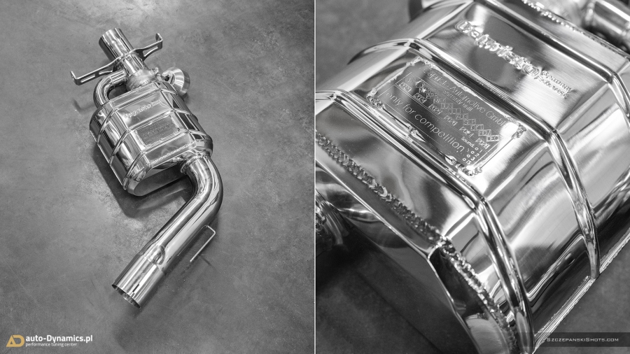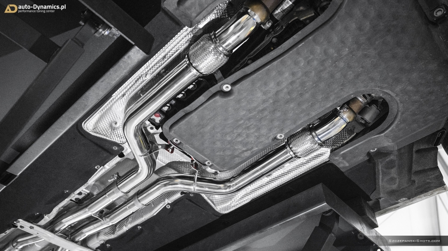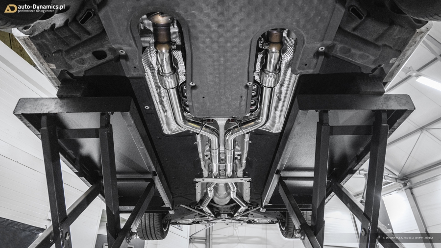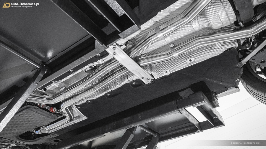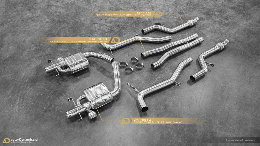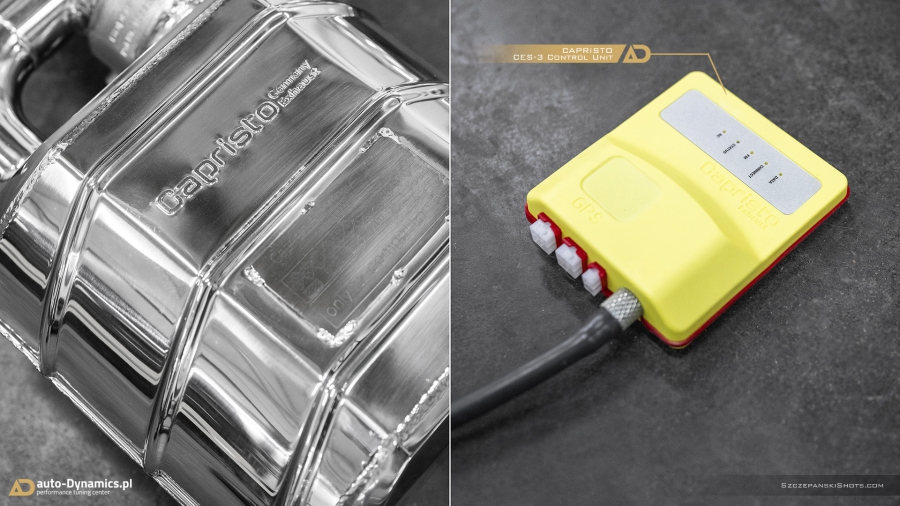 Strojenie słyszalności szalenie instrumentalnej V-Ósemki przeprowadziliśmy bez użycia kamertonów. Podczas eskalacji brzmienia posłużyliśmy się wybitnie dostrojonym dźwiękowo, profesjonalnym a zarazem sportowym układem wydechowym od legendarnej i ekskluzywnej, renomowanej niemieckiej manufaktury – atelier Capristo. Kompletację zainstalowanego przez #teamAD zestawu stanowi para sportowych tłumików końcowych z zaimplementowanym systemem zaworów / przepustnic odpowiadających za wybór akustycznego poziomu natężenia emitowanych przez widlastą jednostkę dźwięków i tonów, wysoko przepustowa sekcja centralna eliminująca restrykcyjny tłumik środkowy oraz pakiet rur „front-pipe’s” który to bezpardonowo wyeliminował obecność fabrycznych, podyktowanych wyłącznie skrajną ekologią, niemonitorowanych przez ECU filtrów OPF / GPF - odpowiedzialnych rykoszetowo za absolutną kastrację generowanych przez jednostkę napędową w układzie V8 motoryzacyjnie zorientowanych nut i brzmień. Całością nowo zainstalowanego układu wydechowego zawiaduje w pełni cyfrowa, zaawansowana, w pełni indywidualnie programowalna jednostka sterująca CES-3 od Capristo, pozwalająca na pełne dostosowanie intensywności brzmienia do aktualnie panujących warunków i potrzeb a status bieżąco wybranego trybu prezentowany jest czytelnie na wyświetlaczu radia samochodowego [za pomocą RDS]. Definiując cechy charakterystyczne systemu Capristo - spokojny podczas długich, autostradowych podróży lub potężna, gardłowa akustyka która zadowoli nawet najbardziej wyszukane preferencje motoryzacyjnych audiofilów. Dodatkowe aspekty na plus to bez wątpienia: znaczna redukcja masy oraz przyrost mocy i wzrost momentu obrotowego. #TopHiFiEnd by #AD