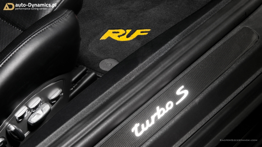 Zmiany nie ominęły również wnętrza pojazdu, choć w tym przypadku miały one charakter subtelny i wyłącznie nawiązujący do zewnętrznych modyfikacji – z racji niesamowicie poprawnej konfiguracji bazowej Porsche. Centralne wykończenie kierownica oraz manetki zmiany biegów wylakierowane zostały w kolorze czarnego fortepianu a sama kierownicy otrzymała żółty akcent „12 o'clock”. Maty podłogowe z żółtym logo oraz nakładki na pedały wraz z podstopnicą wieńczą całość zmian wewnętrznych [produkty cenionej firmy RUF].