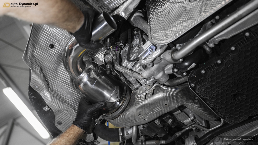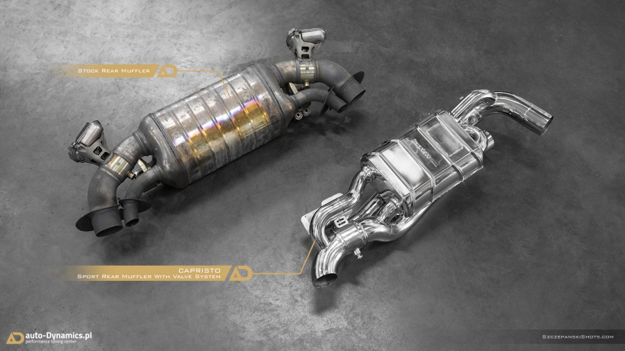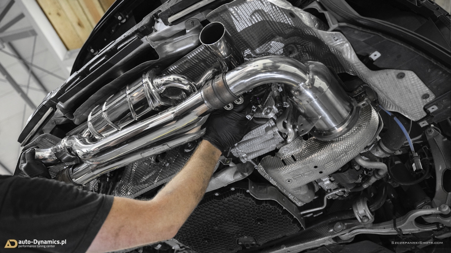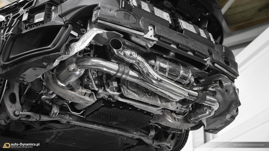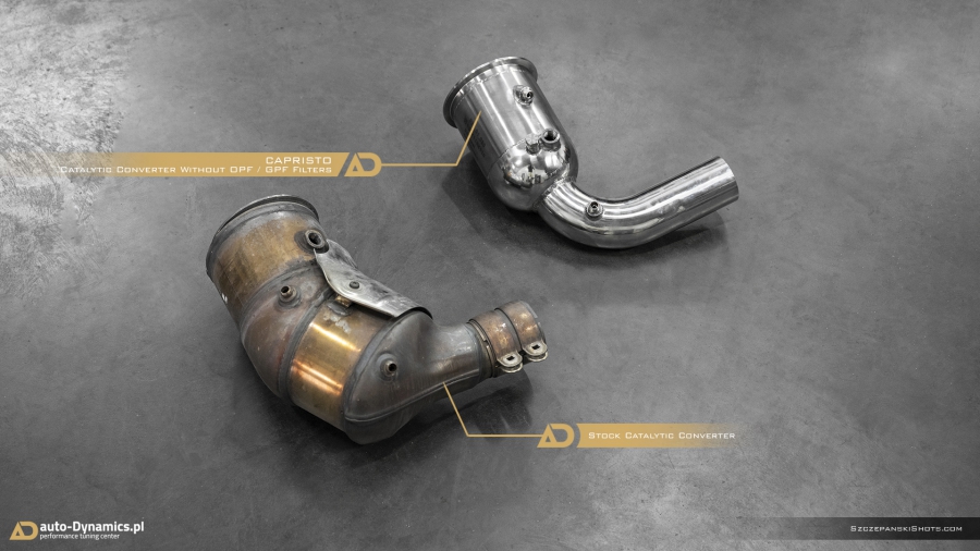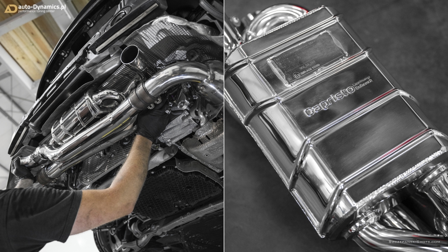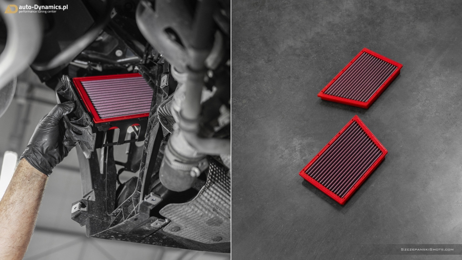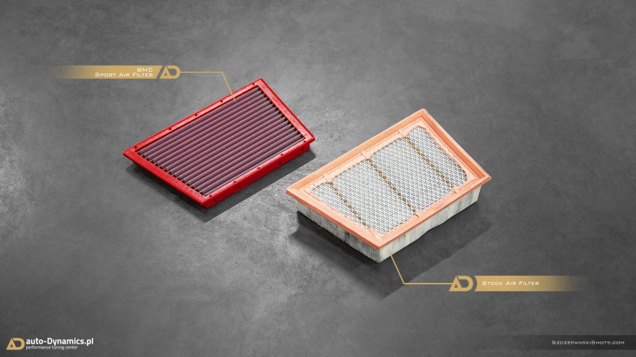 Redefinicję cech dualistycznie turbodoładowanej dziewięćset-jedenastki zainaugurowaliśmy wymianą kompletnego układu wydechowego. Sięgając po wielokrotnie zweryfikowane przez nas, high-end’owe rozwiązania, fabryczny system ustąpił miejsca profesjonalnemu, sportowemu układowi wydechowemu od legendarnej i ekskluzywnej, renomowanej niemieckiej manufaktury – atelier Capristo. Zainstalowana przez #teamAD kompletacja typu „Turbo-Back” to wysoce wydajny tłumik końcowy o zwiększonej przepustowości spalin wraz z zintegrowanym systemem zaworów / przepustnic odpowiadających za wybór akustycznego poziomu natężenia emitowanych przez Boxer’ową jednostkę dźwięków i tonów. Fonią wyczynowego układu wydechowego Capristo zawiaduje on-board’owy komputer Porsche. Dopełnienie kompozycji stanowi zestaw rur łączących które to maksymalizują przepustowość gazów spalinowych dzięki zaimplementowanych, sportowych, 250-komórkowych katalizatorom. Ponadto pakiet „link-pipe’ów” z pracowni Capristo wyeliminował skutecznie obecność fabrycznych, podyktowanych wyłącznie skrajną ekologią, filtrów OPF / GPF - odpowiedzialnych rykoszetowo za absolutną kastrację generowanych przez jednostkę napędową w układzie B6 motoryzacyjnie zorientowanych nut i brzmień. Nie do pominięcia pozostają również fakty, iż dzięki zastosowanym materiałom a także niebywałej wręcz precyzji i jakości wykonania, układ wydechowy Capristo jest dużo lżejszy od fabrycznego systemu, wytrzymalszy bowiem obarczony wieczystą gwarancją producenta jak również, na skutek przeprojektowanej drodze spalin, dostarcza fenomenalny dźwięk, którego fabrycznemu Turbo S po prostu brakuje. Dodatkowe aspekty na plus to bez wątpienia przyrost mocy i wzrost momentu obrotowego. Kolejny etap modyfikacyjnej trawestacji najmocniejsze odmiany dziewięćset-jedenastki to subtelna metamorfoza układu dolotowego. W 992, skrajnie niewydolne, papierowe filtry zastąpiliśmy ich performance’owym zamiennikiem wprost od niekwestionowanego lidera, włoskiego producenta – firmy BMC. Panelowe filtry powietrza BMC wykonane są z wysoko przepustowej bawełny dodatkowo zbrojonej nitkami stali. Zapewniają efektywniejszy dostęp zimnego powietrza do komory spalania przy jednoczesnej, lepszej filtracji wszelkich zabrudzeń. Są filtrami wieczystymi i nie wymagają wymiany a jedynie okresowej konserwacji. #PerformanceWithoutExcusesByAD