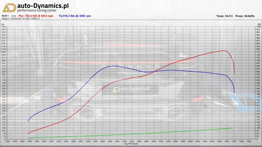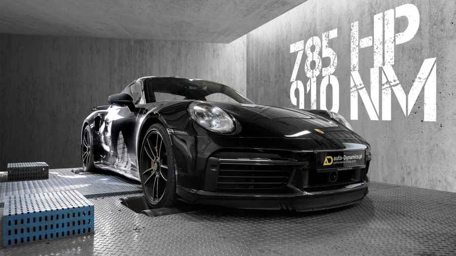 Wykorzystując wniesiony potencjał w 911-nastkę modyfikacji mechanicznych, przystąpiliśmy do profesjonalnego przeprogramowania jednostki sterującej silnikiem [Chiptuning ECU]. Właściwości nominalne / katalogowe przedstawione przez Porsche to: 650KM (478kW) i 800Nm. Efekty wniesionych przez #AD zmian i zabiegów które to zmierzyliśmy na hamowni to 785KM (577kW) i 910Nm [Przyrost: +135KM (+99kW) i +110Nm]. Ponadto w oprogramowaniu 992 usunęliśmy całkowicie limiter prędkości V-Max [obecnie powyżej 340km/h+] oraz dodaliśmy agresywniejsze „pops&bangs” w trybie sportowym. Wzrost parametrów na tym poziomie zapewnia absolutną bezawaryjność jednostki napędowej w połączeniu z rewelacyjnymi osiągami. Różnica przyspieszenia zarówno w przedziale 0-100km/h jak i 100-200km/h [poniżej 5s] a także 200km/h-UP tudzież 300km/h+ jest absolutnie kolosalna. Odczucia z jazdy, w połączniu z napędem AWD, są teraz naprawdę niesamowite, a elastyczność dzięki momentowi obrotowemu dostępnemu w szerokim zakresie obrotów zdumiewa na każdym biegu! #992LevelUpByAD